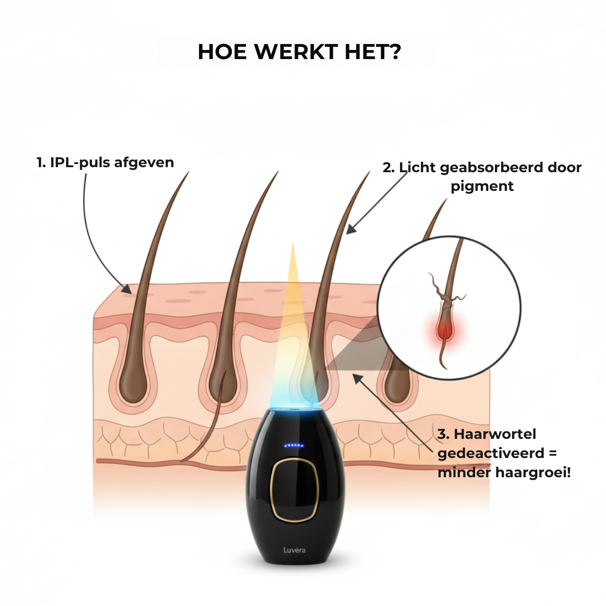 Aanpak van de Oorzaak: Scheren en ontharingscrèmes behandelen alleen het oppervlak. De Luvera IPL, met klinisch bewezen technologie, pakt direct de haarwortel aan en verstoort de groeicyclus, waardoor het haar langdurig wegblijft.